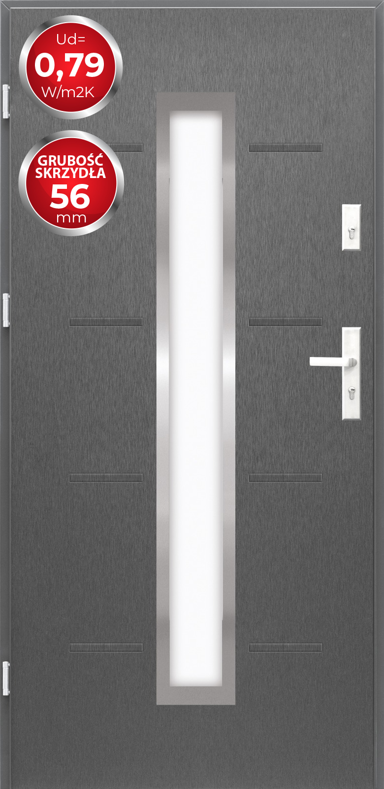 | Akcesoria w komplecie: | 6 rygli antywyważeniowych, ościeżnica kompozytowa, próg aluminiowy z przekładką termiczną, dwie wkładki bębenkowe (system jednego klucza), zawiasy regulowane w 3 płaszczyznach |